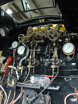 A view of the AWS cab equipment along with the speedometer, brake and boiler pressure gauges. |