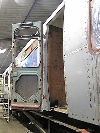 | First class compartment C with ceiling refitted along with the overhauled seat-back structure. | South end where the steel bottom-plate has just been renewed and the main end pillars put in place. | |||