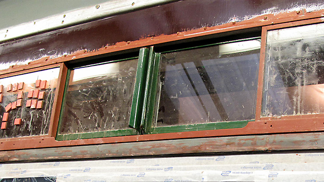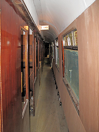 | Coach end description plates. | View from north end with filler rubbed down and red oxide painting in progress. | |||