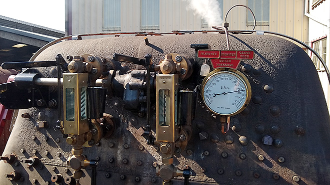The steam combine undergoing a hydraulic test. The combine controls steam to the injectors, boiler pressure gauge and other cab fittings. |